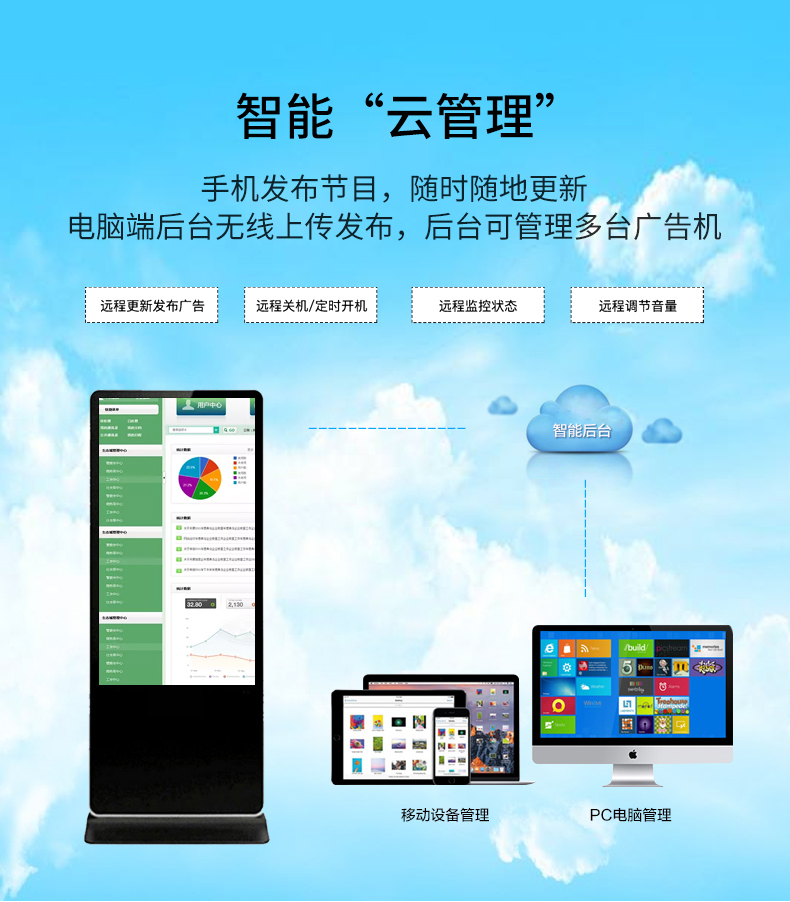 分時音量、背景音樂、滾動字幕、臺標、背景圖片、遠程開關機、流媒體、插播定時播放、多個節目樣式循環播放、定時轉播電視。遠程控制監控廣告機,,可暫停重啟,格式化等操作。 |